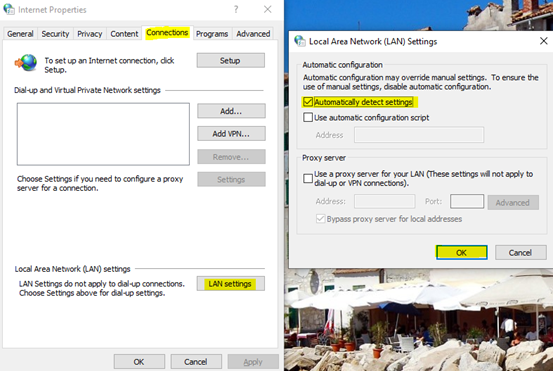 2. Click on the ‘Connections’ tab, select ‘LAN Settings’ and ensure the ‘Automatically detect settings’ option is ticked.